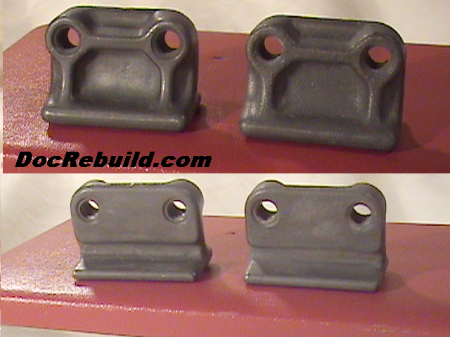 Original 63 die cast Zinc Hood Blocks (2 pieces) with fainty visible OEM manufacturers logo on the surface as well as mold cavity #2 on one and #4 on the other. These ID marks are in the recessed cavity in the upper photo. Reproductions lack these features.