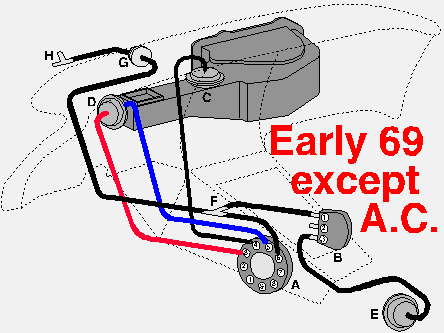 | We include a complete set of Color Coded Hoses, T-pipe Connectors and Hose Clamps - PLUS a Full Color Schematic with Full Instructions and Installation Tips. EARLY 69 uses Rubber Hose to the Rear Vent Doors; LATE 69 uses Metal Tubing. | |